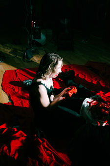 My biggest inspiration for this music video was the 1973 horror film, Messiah of Evil. In honor of the grungy, bloody, simplistically horrifying practical effects of vampire/zombie cult-classics, I opted for handmade boutonnières of dried flowers, thrifted theater costumes, pale face makeup, thick red eyeliner, and (my favorite) guts made of Pillsbury cinnamon roll dough and red corn syrup.